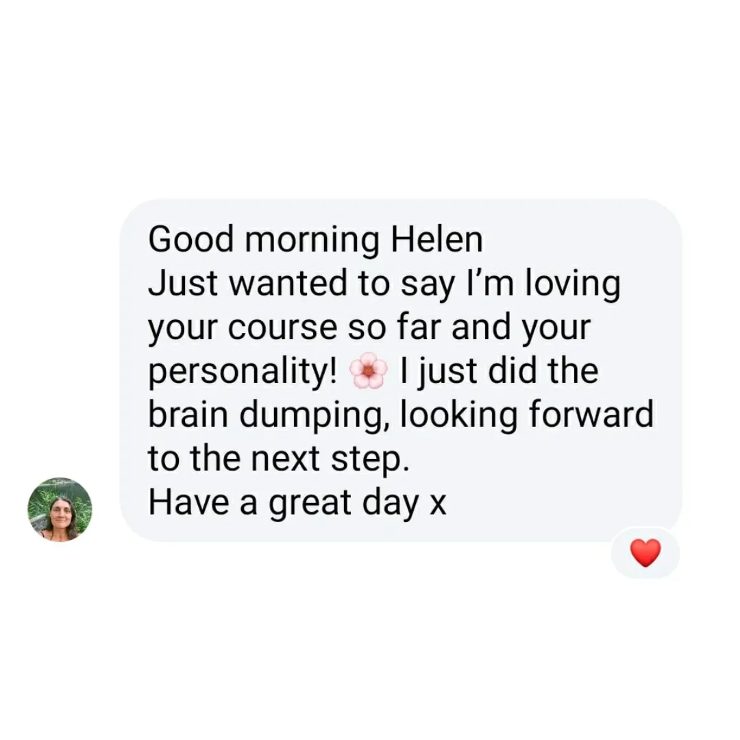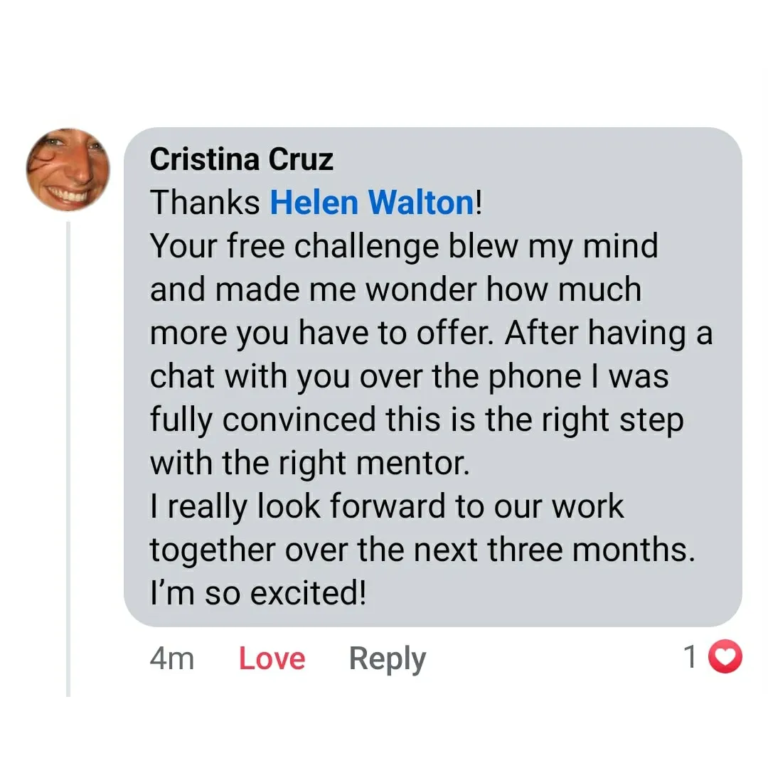"Helen's support and program is so easy to follow and implement. Her advice and content is full of realistic, honest info and her authentic nature really shows her passion for inspiring others. I'm so grateful for all the support, the encouragement and the steps to finally get clear on what I need to do."